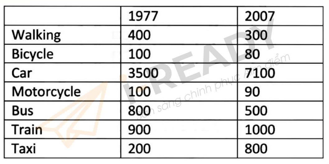 Question: The table below gives information about the average annual distance travelled by adults and the types of travel in 1977 and 2007