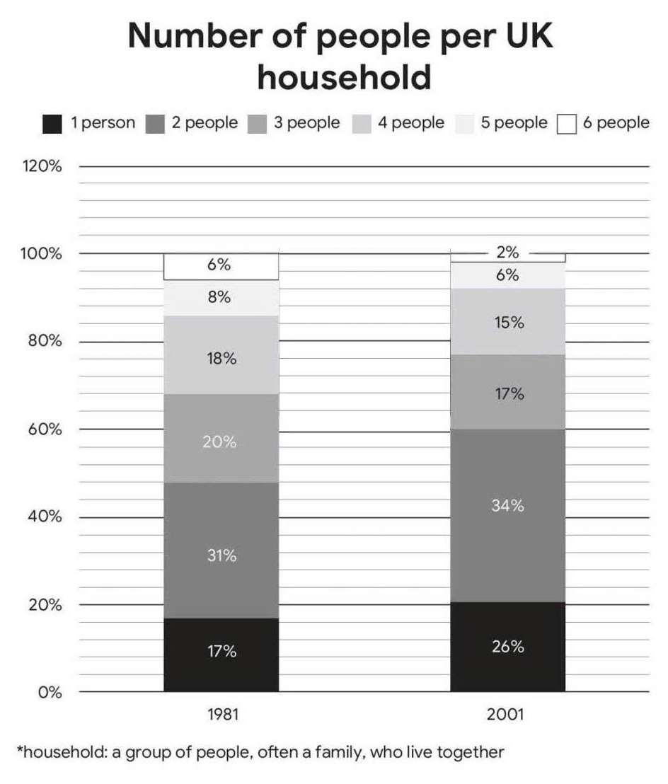 Question: The chart below compares the number of people per household* by percentage in the UK in 1981 and 2001.