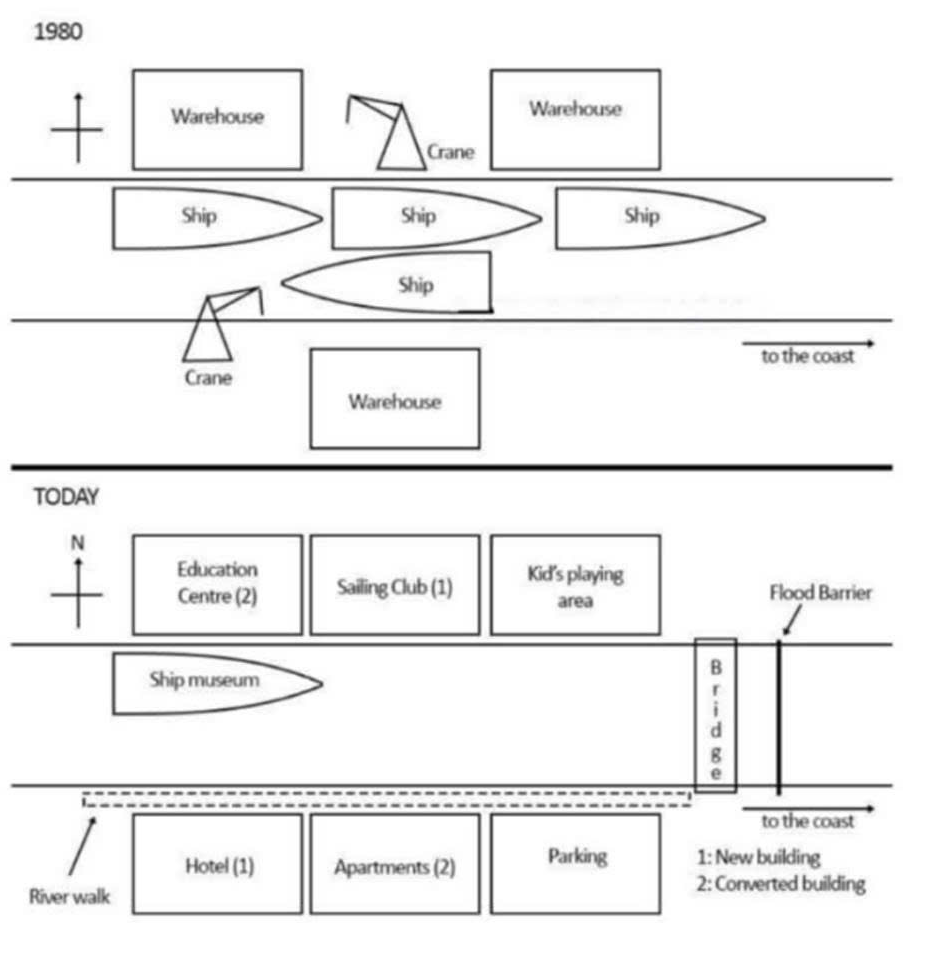 By contrast, the docks today have undergone extensive redevelopment with a clear emphasis on public amenities and tourism. All warehouses, cranes and ships have been removed, with the exception of one vessel which has been converted into a ship museum. The northern part of the site now accommodates an education centre, a sailing club and a children’s play area, reflecting a shift towards community-oriented services. Meanwhile, the southern bank is occupied by a hotel, apartments and a parking area, linked by a newly created river walk. Additionally, a bridge has been constructed at the eastern end, along with a flood barrier to protect the area from potential water damage. (223 words)