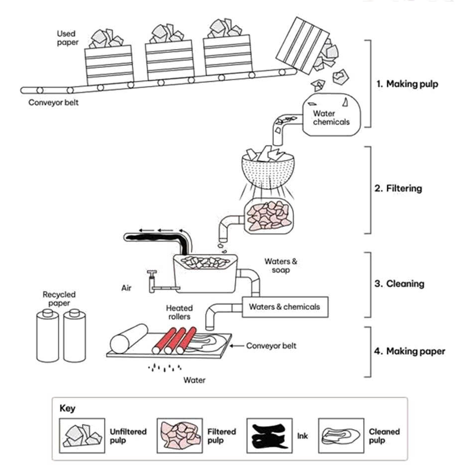 Question: The diagram illustrates how used paper is recycled through a four-stage process, beginning with pulp creation and ending with the production of new paper rolls.