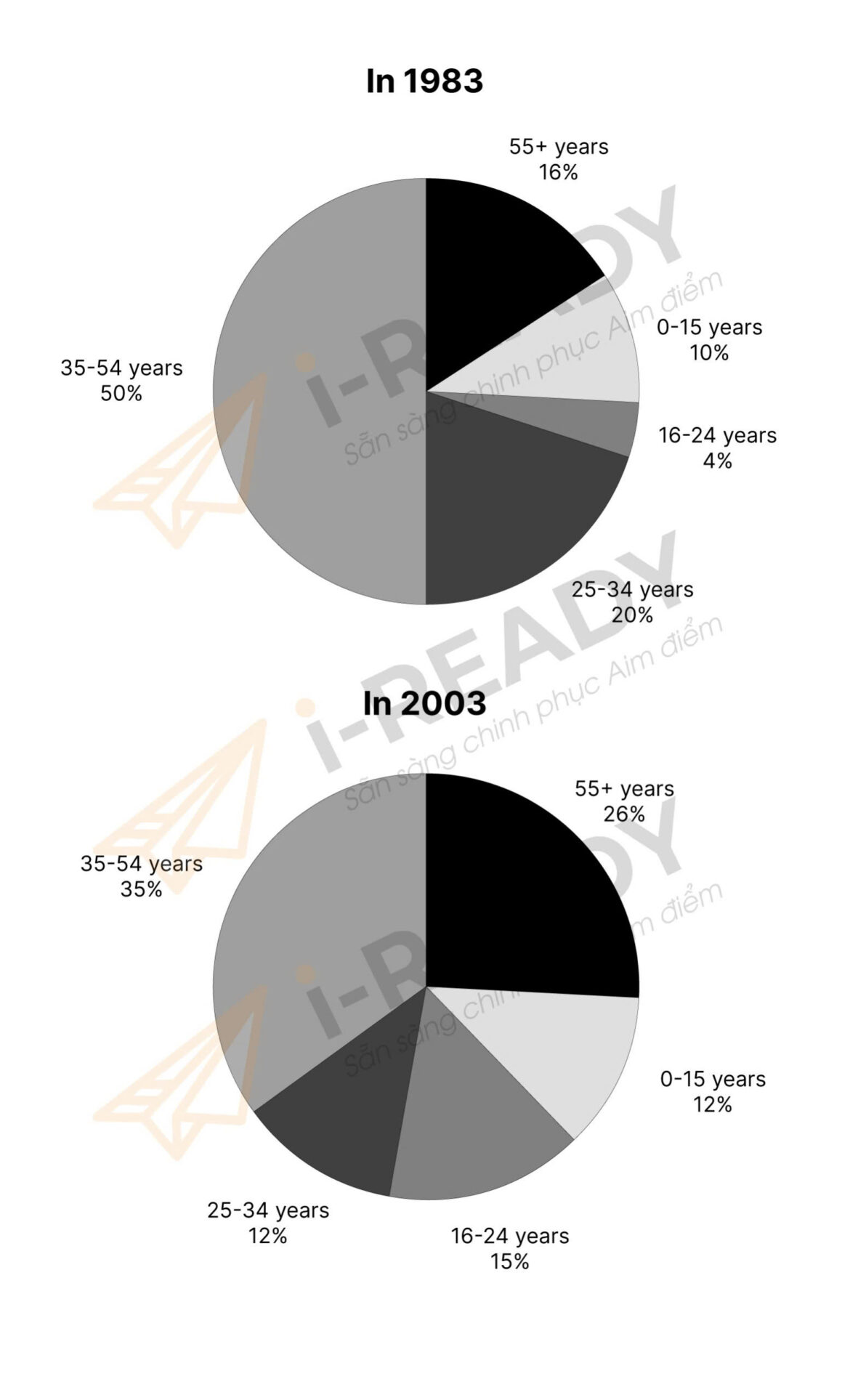 Question: The charts below give information about the age of visitors from the UK to Spain in 1983 and in 2003.