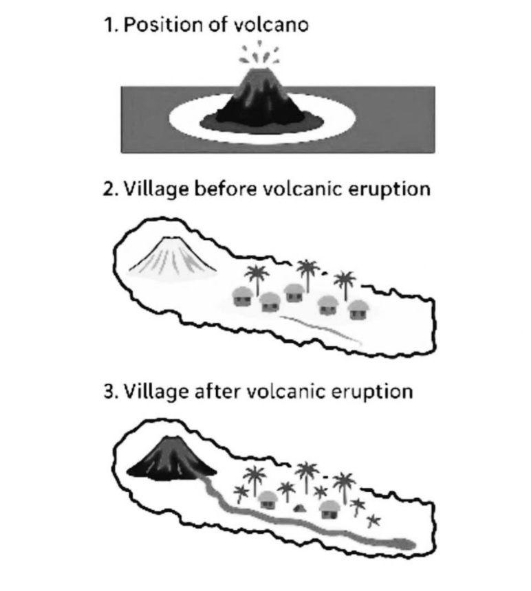 The diagrams illustrate the location of a volcano in relation to a nearby village, showing the village’s condition both before and after a volcanic eruption.