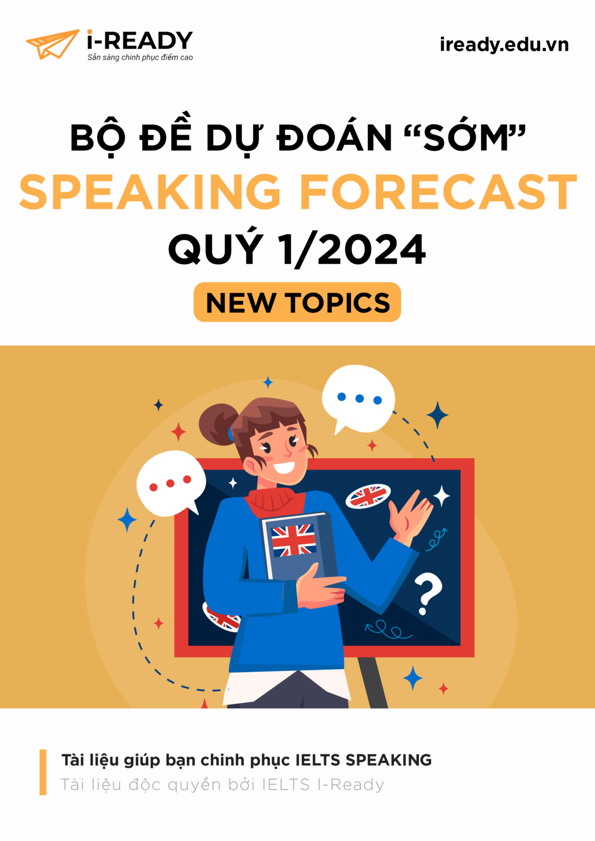 Đây là bản dự đoán “Sớm” do đội ngũ chuyên môn của IELTS I-Ready đã cập nhật và biên soạn cùng các chủ đề mới NEW TOPICS. Hy vọng bộ đề dự đoán sớm Speaking Forecast này sẽ giúp chúng mình trong quá trình ôn tập để chuẩn bị cho kỳ thi vào quý đầu năm 2024 được tốt hơn ở kỹ năng Speaking.